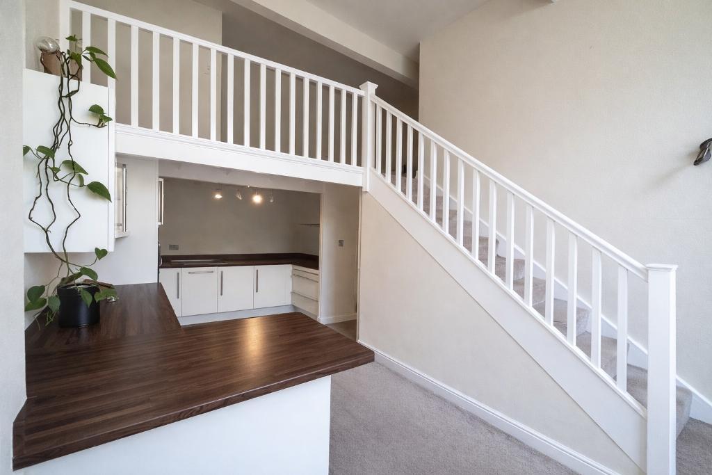The well-appointed kitchen is fitted with modern units and integrated appliances, ideal for both everyday living and entertaining. The mezzanine level provides a versatile space overlooking the main living area, perfect for use as a bedroom, a home office, or additional lounge area. The double bedroom benefits from fitted wardrobes.