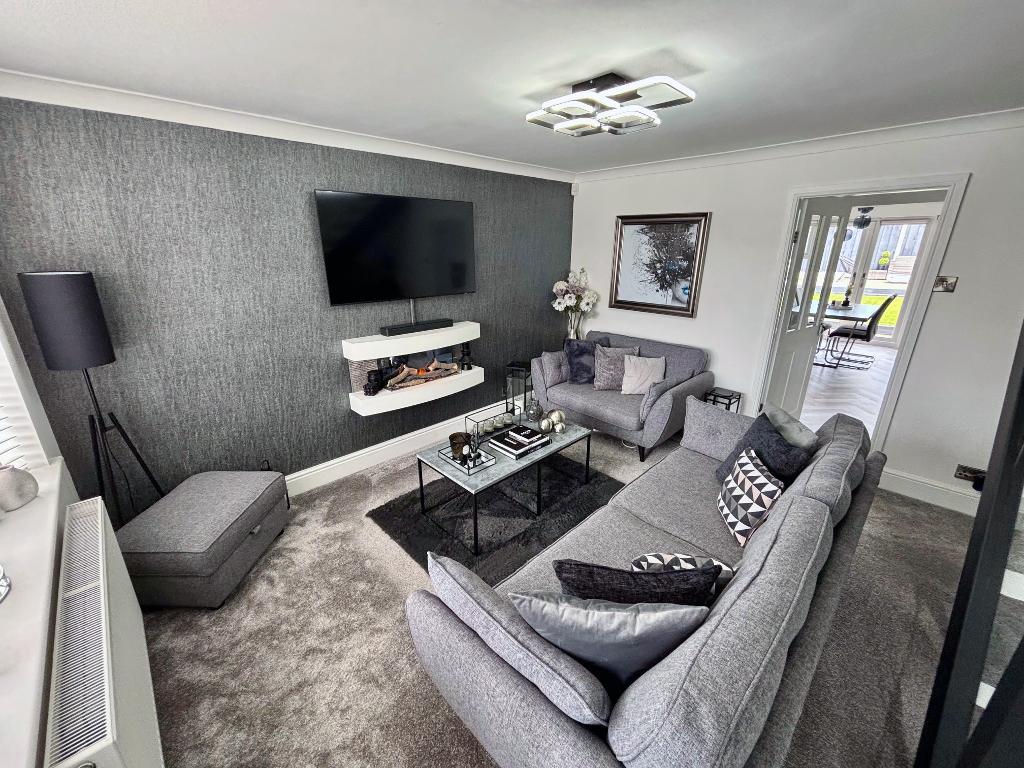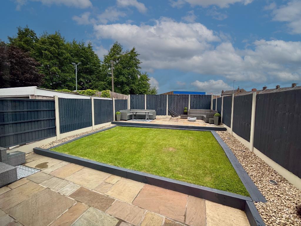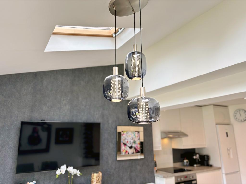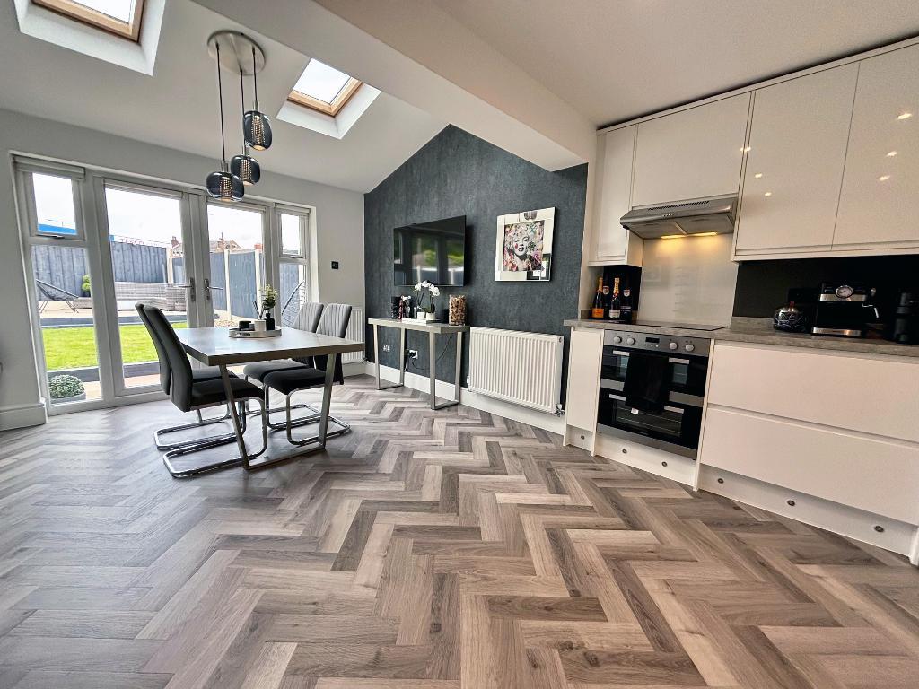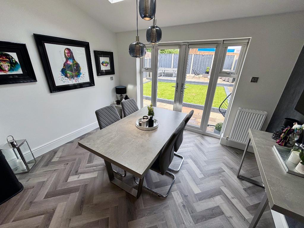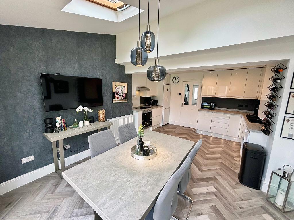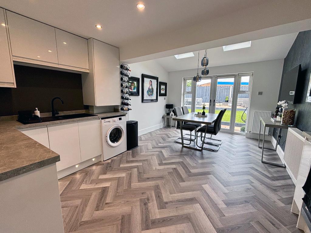 The accommodation comprises of entrance porch area, good sized lounge with open feature glass staircase, large open plan kitchen/dining room/family room, with a range of high gloss fitted wall and base units, complimentary work surfaces, integral appliances and velux skylight windows. Double patio doors overlook the spacious and modern private rear garden, with a laid to lawn area, two spacious patio areas with stone and light borders.